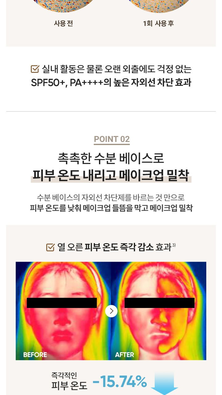 Applying a moisture-based UV protectant alone can lower skin temperature, preventing makeup from lifting and ensuring close adhesion. It instantly reduces skin temperature by 15.74% and creates a beautiful skin without clumping due to its excellent adhesion.