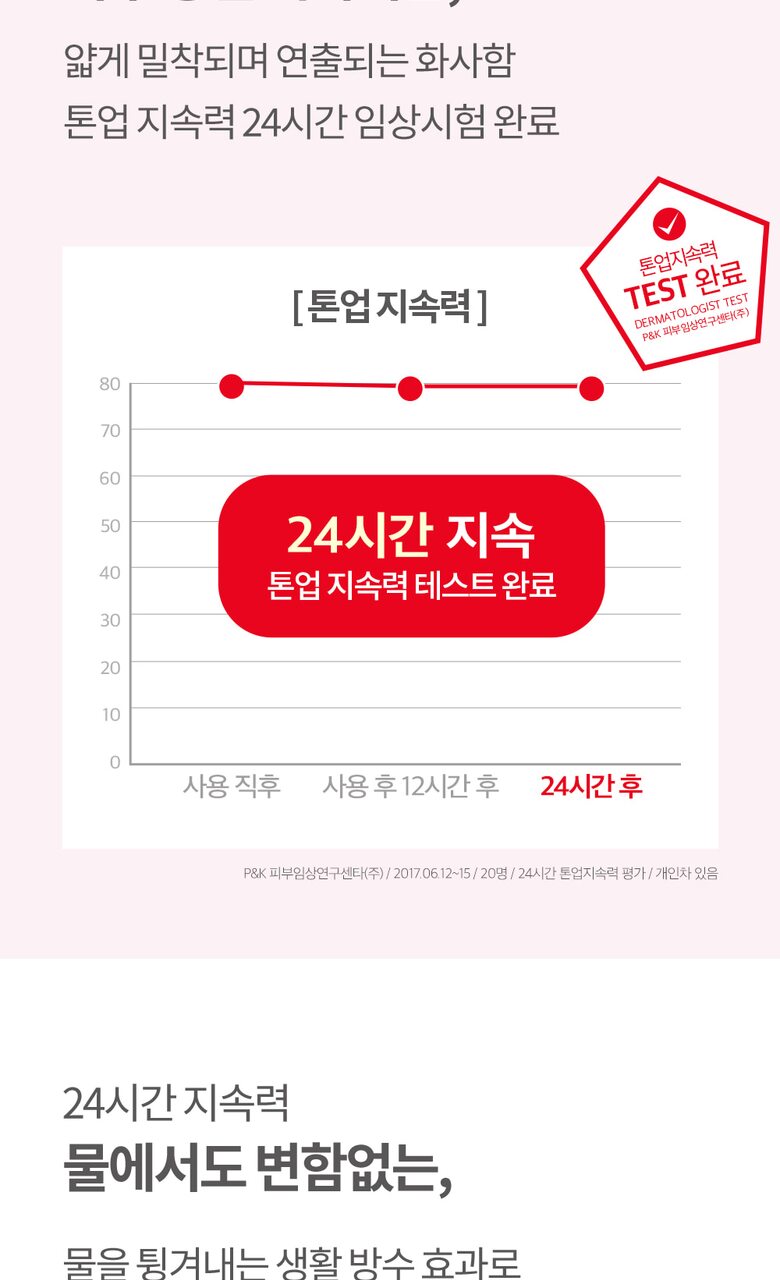 It provides a 24h-lasting tone-up effect with basic waterproof function against sweat and moisture.